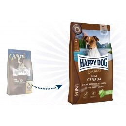 Happy Dog Sensible Mini Canada to bezzbożowa, sucha karma, która jest harmonijnym połączeniem delikatnego łososia, smacznego królika i pożywnej jagnięciny, uzupełnione bezglutenowym ziemniakiem, które oczarują nawet najbardziej wybredne podniebienia.