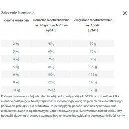 Podawać w formie suchej lub zalać świeżą podgrzaną wodą (ok. 60°C) i pozostawić na kilka minut do nasiąknięcia. Należy zapewnić w psu stały dostęp wody. W razie dodatkowego podawania przekąsek lub produktów uzupełniających, podane ilości należy odpowiednio zredukować. Dane te są orientacyjne. Zapotrzebowanie jest różne w zależności od wieku, rasy, hodowli i aktywności. Dlatego też może być konieczne indywidualne dostosowanie ilości karmy.