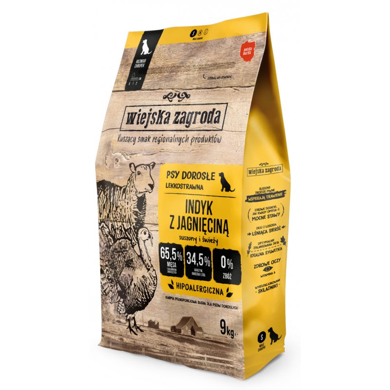 Wiejska Zagroda Indyk z Jagnięciną to pełnowartościowa karma, która łączy w sobie aż 65,5% mięsa z dodatkiem tłuszczu i oleju z łososia oraz 34,5% wartościowych warzyw, owoców, ziół i witamin. Ta wyjątkowa receptura, pozbawiona zbóż, glutenu, GMO i sztucznych dodatków, nie tylko wspiera zdrową sierść, lecz także zapewnia niską zawartość węglowodanów. Odpowiednia dla delikatnych żołądków, oparta na lokalnych składnikach, ta karma stanowi lekkie i smaczne źródło pożywienia dla Twojego pupila.