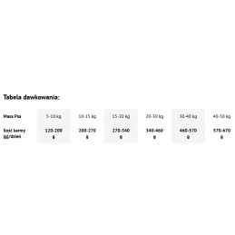 Przestrzegając zalecanych ilości podawanej karmy, opiekun ma gwarancję odpowiedniego odżywienia psa, bez pojawienia się ryzyka nadwagi i otyłości. Należy pamiętać o zapewnieniu psu stałego dostępu do świeżej wody do picia, która w sposób naturalny wspomaga przyswajanie składników w niej zawartych. Na produkcie może występować biały nalot, który jest efektem naturalnie zachodzącej krystalizacji składników mięsa. Nie ma on wpływu na jakość karmy.
