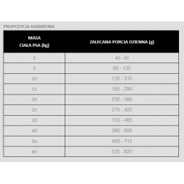 Podane w tabeli dzienne zapotrzebowanie jest orientacyjne. Każdy pies jest inny i ma rożne potrzeby. Obserwuj swojego zwierzaka i zwiększ lub zmniejsz jego porcję dzienną karmy w razie potrzeby. Pamiętaj, aby zapewnić mu stały dostęp do świeżej wody!