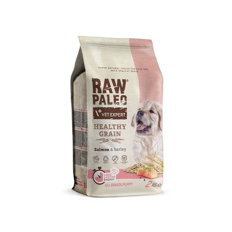 Raw Paleo Healthy Grain Puppy Salmon to wyśmienita i zbilansowana sucha karma przeznaczona dla szczeniąt wszystkich ras, od momentu odsadzenia aż do kończenia ich pierwszego roku życia. Głównym składnikiem tej karmy jest wysokiej jakości suszone mięso z łososia, które z pewnością przypadnie do gustu młodym psom. Dodatek suszonych ryb dodatkowo podnosi walory odżywcze tej karmy. Dzięki niej Twoje szczenię otrzyma wszystkie składniki niezbędne dla zdrowego wzrostu.