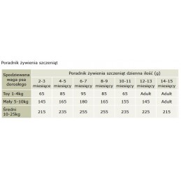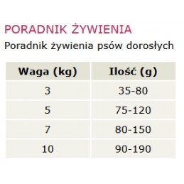 - Białko 36%, Tłuszcz 19%, Włókna surowe 3%, Popiół surowy 10%, Wilgoć 8.5%, Omega 6 3.21%, Omega 3 0.90%, Wapń 2.13%, Fosfor 1.32%.