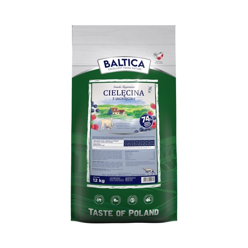 BALTICA SMAKI REGIONÓW Cielęcina z jagnięciną dla dużych psów to wysokiej jakości sucha karma stworzona specjalnie z myślą o dorosłych psach średnich i dużych ras. Receptura bogata w cielęcinę i jagnięcinę zapewnia wysoko przyswajalne białko zwierzęce, które wspiera rozwój mięśni i utrzymanie dobrej kondycji fizycznej Twojego pupila. Bezzbożowa formuła z dodatkiem batata to doskonałe rozwiązanie dla psów z wrażliwym układem pokarmowym, minimalizując ryzyko nietolerancji pokarmowych i alergii, jednocześnie wspierając zdrowe trawienie.