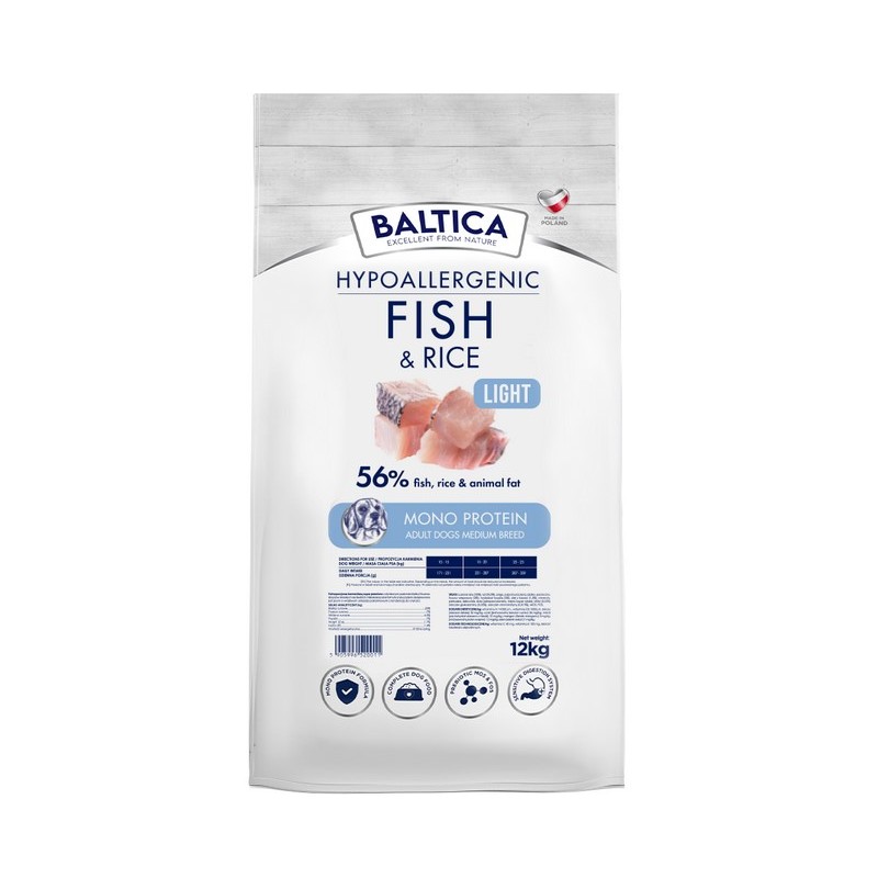 BALTICA NUTRACEUTIC Hypoallergenic Fish and Rice Light dla psów ras średnich to wysokiej jakości sucha karma stworzona z myślą o psach z wrażliwym układem pokarmowym oraz tendencją do nadwagi. Hipoalergiczna i niskotłuszczowa receptura oparta na suszonym mięsie ryb zapewnia optymalne źródło łatwo przyswajalnego białka, a dodatek lekkostrawnego ryżu ułatwia trawienie. Karma jest całkowicie bezzbożowa, co czyni ją idealnym wyborem dla zwierząt z nietolerancjami pokarmowymi. Zawartość ziół i nutraceutyków, w tym owocu dzikiej róży, wspomaga układ odpornościowy, a kompleks wspierający stawy dba o zdrowie stawów i chrząstek.