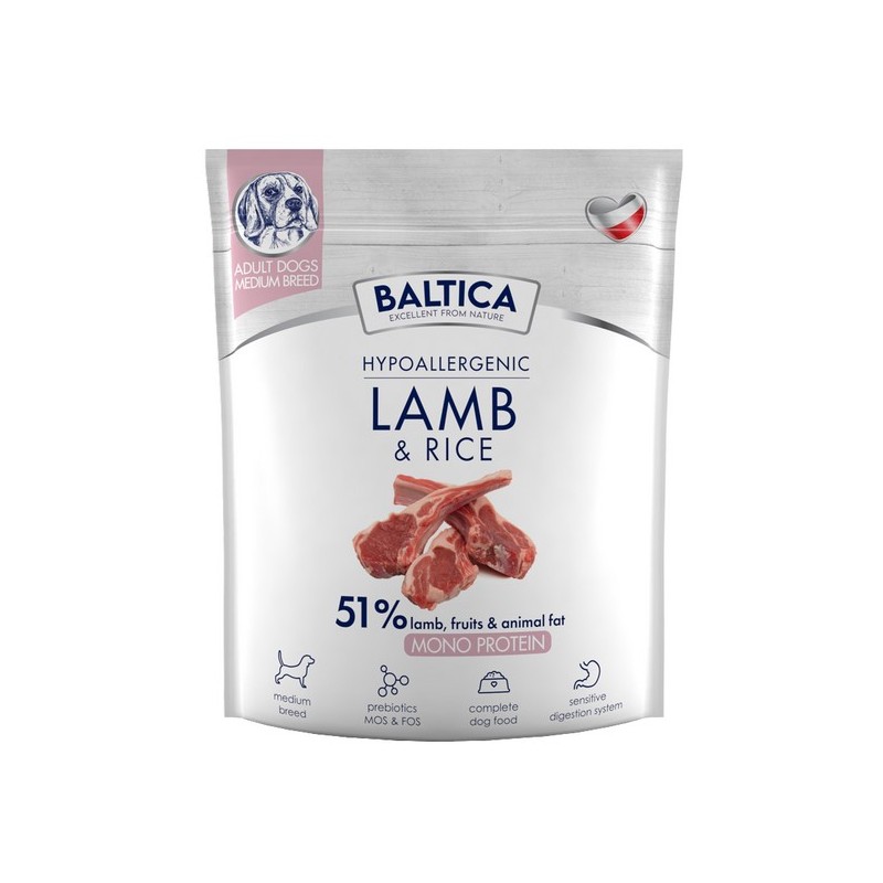 BALTICA NUTRACEUTIC Hypoallergenic Lamb and Rice to wysokiej jakości sucha karma stworzona specjalnie dla psów średnich ras, która dzięki swojej hipoalergicznej recepturze, doskonale sprawdza się w przypadku psów o wrażliwym układzie pokarmowym. Jej podstawą jest mięso jagnięce, będące źródłem lekkostrawnego i wysoko przyswajalnego białka, niezbędnego dla prawidłowego rozwoju i zdrowia Twojego pupila. Dodatek lekkostrawnego ryżu wspomaga procesy trawienne, zapewniając łatwą przyswajalność składników odżywczych.
