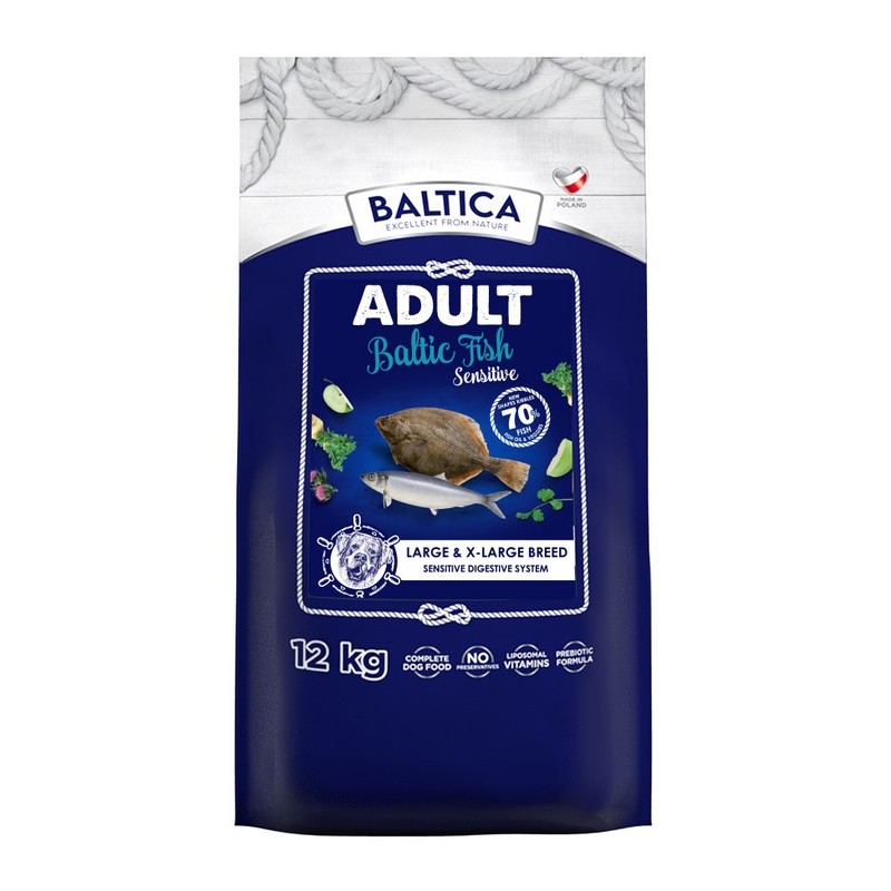 BALTICA EXCELLENT Adult Sensitive Baltic Fish to hipoalergiczna sucha karma stworzona specjalnie dla psów dużych ras, które borykają się z problemami dermatologicznymi lub nietolerancją pokarmową. Jej unikalna formuła oparta jest na dzikich rybach bałtyckich, takich jak szprot, śledź i flądra, co zapewnia doskonałe źródło lekkostrawnego białka i cennych kwasów Omega-3, które wspierają zdrowie skóry i sierści. Karma została wzbogacona o dodatki owocowe, takie jak jabłoń, czarna porzeczka i dzika róża, które dostarczają antyoksydantów wspomagających odporność.