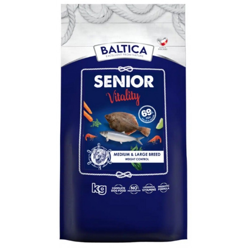 BALTICA EXCELLENT Senior Vitality M/L to pełnoporcjowa, bezzbożowa karma klasy super premium, stworzona z myślą o psach od 7. roku życia lub czworonogach ze skłonnościami do nadwagi. Jej wyjątkowa receptura, oparta na dzikich rybach bałtyckich (szprot, śledź, flądra) i dodatku MARINE SUPER FOODS, zapewnia optymalne odżywienie, wspierając zdrowie, witalność oraz kontrolę masy ciała