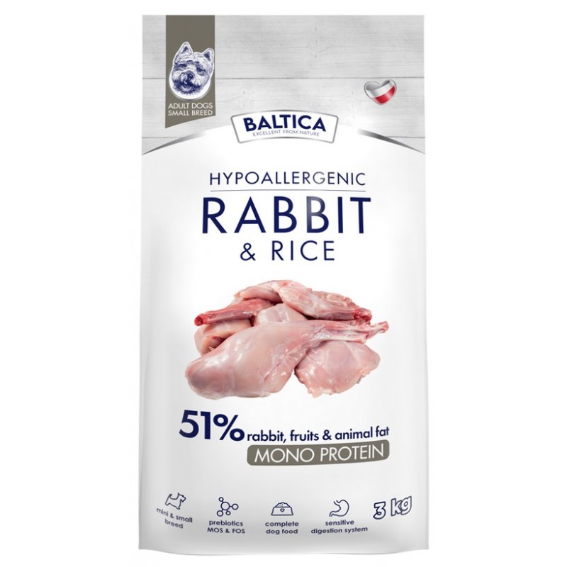 BALTICA NUTRACEUTIC Hypoallergenic Rabbit & Rice to pełnoporcjowa karma super premium stworzona z myślą o psach ras małych i miniaturowych, które potrzebują specjalistycznej diety wspierającej ich zdrowie. Oparta na jednym źródle hipoalergicznego białka – mięsie królika – oraz lekkostrawnym, bezglutenowym ryżu, karma zapewnia optymalne odżywienie, wspierając układ pokarmowy, odporność i zdrowie stawów.