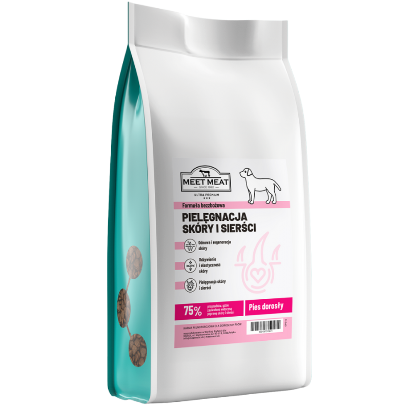 MEET MEAT Pielęgnacja Skóry i Sierści to karma z serii funkcjonalnych karm MEET MEAT, przeznaczona dla psów z problemami dermatologicznymi, suchą skórą lub matową sierścią.