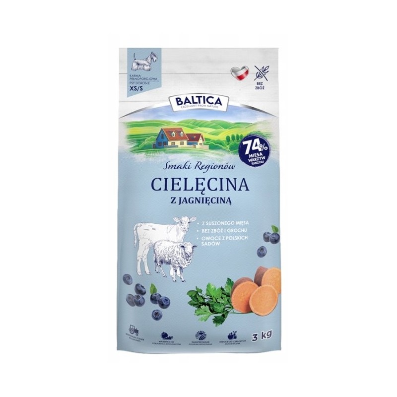 BALTICA SMAKI REGIONÓW Cielęcina z jagnięciną dla małych psów to wysokiej jakości, sucha karma opracowana specjalnie z myślą o potrzebach dorosłych psów małych ras. Bezzbożowa receptura oparta na delikatnej jagnięcinie i cielęcinie dostarcza wysoko przyswajalnego białka zwierzęcego, kluczowego dla prawidłowego rozwoju i utrzymania zdrowej kondycji Twojego pupila. Dodatkowo, obecność batatów jako naturalnego źródła węglowodanów wspomaga trawienie i dostarcza energii niezbędnej do codziennych aktywności.