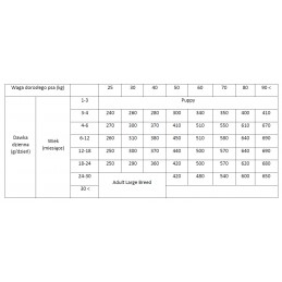 Zalecane dzienne dawki podane w tabeli dawkowania należy podzielić na 2-3 równych porcji i podawać w ciągu dnia. Karmę można podawać suchą lub zwilżoną letnią wodą. Jeśli karma Brit Care jest podawana po raz pierwszy, należy wymieszać ją z dotychczas podawaną karmą i stopniowo w ciągu 7 dni zwiększać dawkę karmy Brit Care. Dzienna dawka może się różnić w zależności od środowiska, aktywności i wieku Twojego psa.