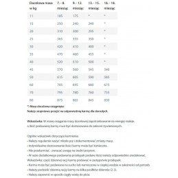 - białko surowe 26,0 %, tłuszcz surowy 13,0 %, włókno surowe 3,0 %, popiół surowy 7,5 %, wapń 1,5 %, fosfor 1,1 %, sód 0,4 %, potas 0,6 %, magnez 0,08 %, kwasy tłuszczowe omega-6 2,5 %, kwasy tłuszczowe omega-3 0,3 %,