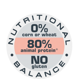 - łosoś (dehydratyzowany, 30%), ryż (30%), mąka ryżowa, tłuszcz zwierzęcy, włókna roślinne (celuloza 3%, wysłodki buraczane 1%), siemię lniane, drożdże piwne, minerały, hydrolizowane białko zwierzęce, olej z łososia (1%), kryl (0,5%), FOS (0,5%), MOS (0,1%), algi morskie (Ascophyllum nodosum), sole kwasów tłuszczowych (kwas masłowy), glukozamina 500 mg/kg, rozmaryn (18 mg/kg), zielona herbata (12 mg/kg)