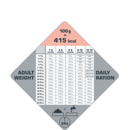 - białko 26,0%, zawartość tłuszczu 17,0%, włókno surowe 2,5%, popiół surowy 7,5%, wapń 1,2%, fosfor 0,9%, kwasy tłuszczowe omega-3 1,6% (EPA 0,4%, DHA 0,5%), kwasy tłuszczowe omega-6 1,4%