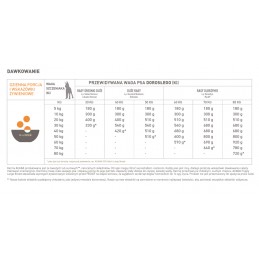 Każdy pies jest inny i dlatego poniższe wskazówki dotyczące karmienia należy traktować orientacyjnie. Kontroluj wagę swojego psa i dopasuj porcję do jego potrzeb. Podawaj karmę 2 razy dziennie i zapewnij psu stały dostęp do czystej, świeżej wody.