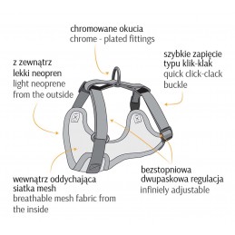 - idealnie dopasowują się do budowy ciała psa dzięki dwupaskowej i bezstopniowej regulacji,