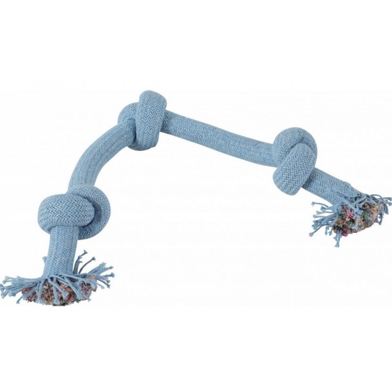 Umieszczone na sznurze trzy mocne węzły nie tylko wzbogacają wygląd zabawki, ale również pełnią ważną funkcję użytkową. Żucie i ciągnięcie węzłów przez psa pomaga w naturalnym czyszczeniu zębów oraz masażu dziąseł, wspierając utrzymanie zdrowia jamy ustnej i zapobiegając problemom z zębami. Zabawka jest świetnym rozwiązaniem dla psów ceniących sobie aktywne formy zabawy, oferując im wiele godzin zaangażowanej rozrywki. Jej estetyczny wygląd dodatkowo sprawia, że stanowi ona atrakcyjny element w przestrzeni domowej.