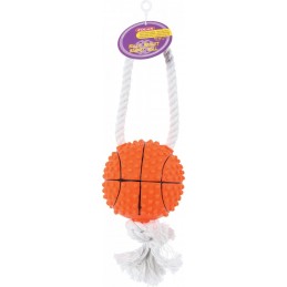 Winylowa piłka do koszykówki ze sznurkiem to doskonała zabawka dla psa, która łączy w sobie funkcję gryzaka, aportu i szarpaka. Dzięki wypustkom masującym pomaga dbać o higienę jamy ustnej, a wytrzymały sznur zapewnia dodatkową frajdę podczas zabawy.