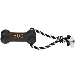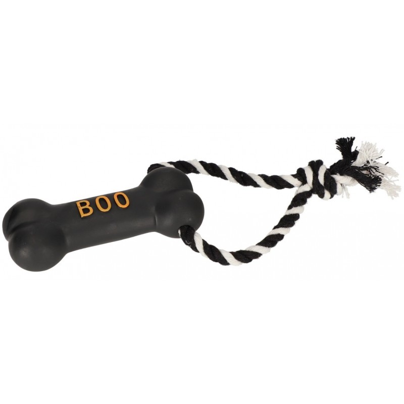 Czarna kość w halloweenowym stylu „BOO” została wykonana z bezpiecznego winylu i wyposażona w piszczałkę, która skutecznie przyciąga uwagę psa i zachęca go do zabawy. Pleciony bawełniany sznur dodatkowo wspiera higienę jamy ustnej – pomaga czyścić zęby i masować dziąsła, poprawiając ich ukrwienie.