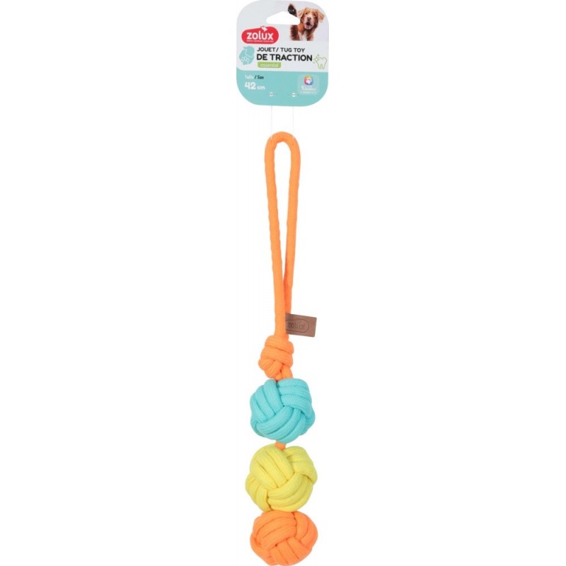 - Konstrukcja z trzema piłkami – trzy sznurkowe piłki połączone liną oferują wiele punktów chwytu, zachęcając do przeciągania, noszenia i gryzienia.