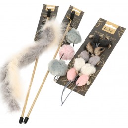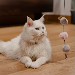 Zabawka została wyposażona w trzy wyjątkowe pompony, z których każdy wyróżnia się innym wyglądem – jeden z eleganckimi złotymi uszami, drugi gładki, a trzeci ozdobiony błyszczącymi kropeczkami. Dzięki temu zabawa staje się jeszcze bardziej interesująca i różnorodna, a kot nie traci zainteresowania.