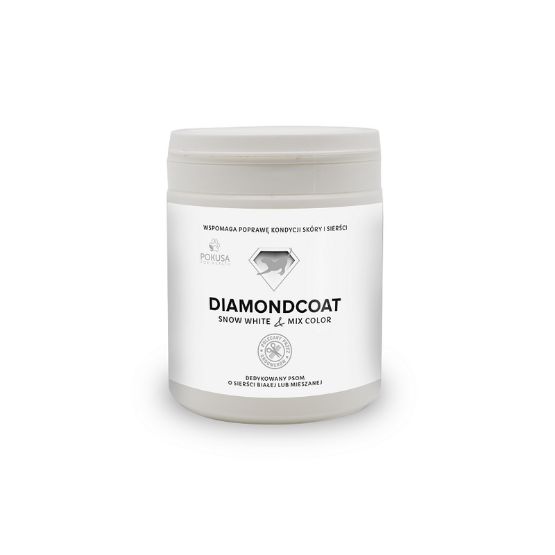 POKUSA DiamondCoat SnowWhite & MixColor to specjalistyczny suplement diety opracowany z myślą o psach o białej, jasnej lub mieszanej z białym sierści, które wymagają szczególnej pielęgnacji koloru, połysku oraz kondycji włosa. Naturalna formuła preparatu wspiera zdrowie skóry, odżywia cebulki włosowe i pomaga utrzymać piękny, jasny odcień sierści bez stosowania sztucznych barwników. Regularne stosowanie preparatu działa od wewnątrz, poprawiając strukturę włosa, jego elastyczność oraz naturalny blask, dzięki czemu sierść psa prezentuje się zdrowo i estetycznie.