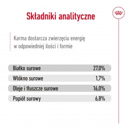 - Białko surowe: 27,0% - Włókno surowe: 1,7% - Oleje i tłuszcze surowe: 16,0% - Popiół surowy: 6,8% - Energia metaboliczna: 3890 kcal/kg.
