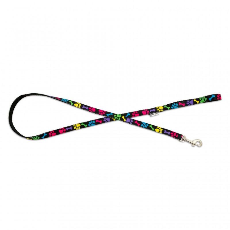 - Radosny, kolorowy wzór – odciski łapek i kości na czarnym tle wyróżniają smycz i dodają jej charakteru