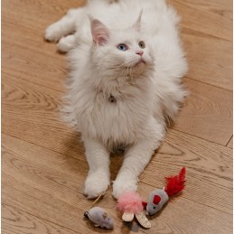 W zestawie znajduje się urocza myszka z dzwoneczkiem oraz piłeczka z błyszczącymi uszkami. Delikatny dźwięk dzwoneczka przyciąga uwagę kota i zachęca go do polowania, a miękkie elementy i ciekawa forma sprawiają, że zabawki są idealne do gonienia, podrzucania i łapania.
